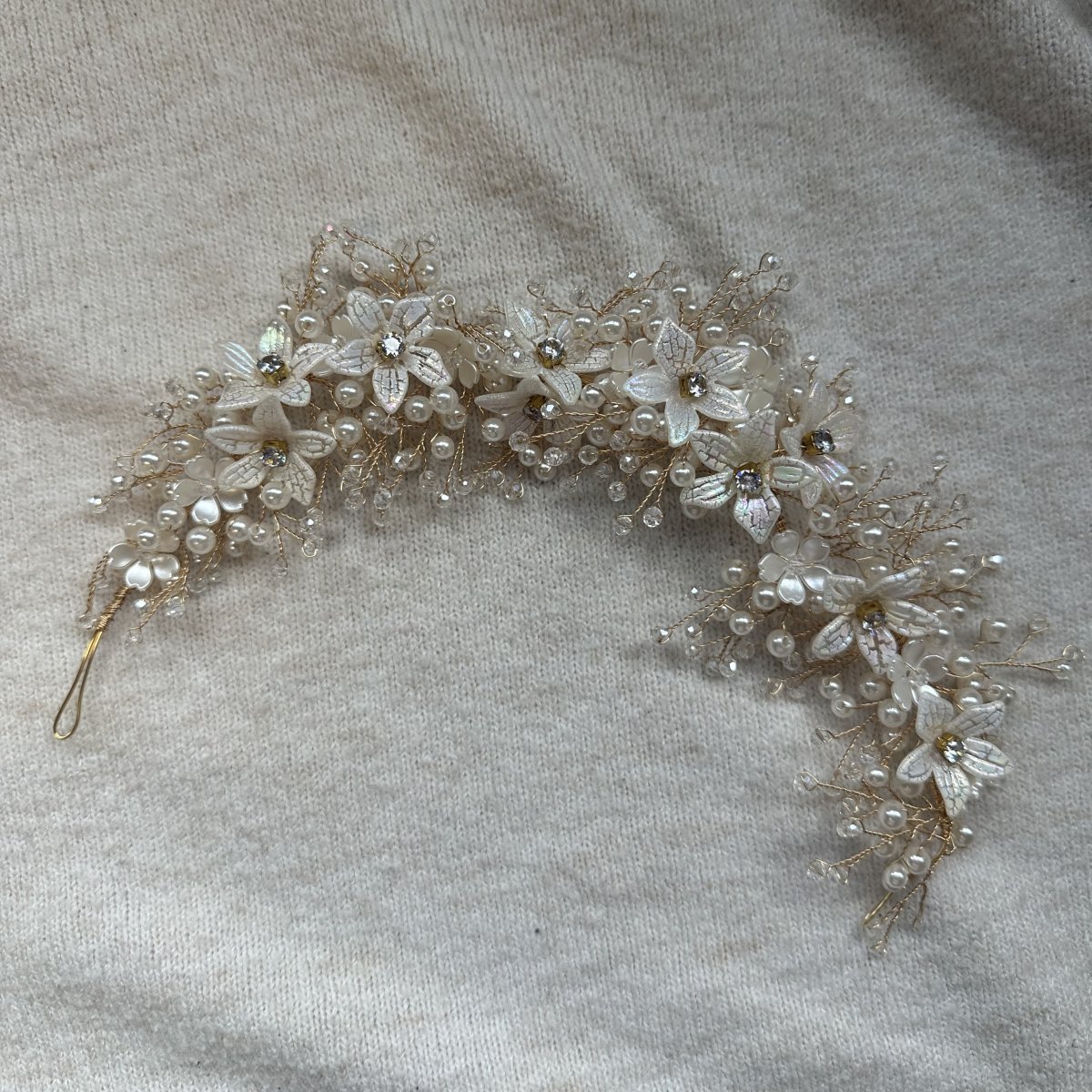 Smycket är guldfärgat med strass, blommor och små pärlor.