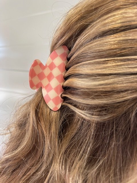 En turkos & gul hårklämma med rutigt mönster.