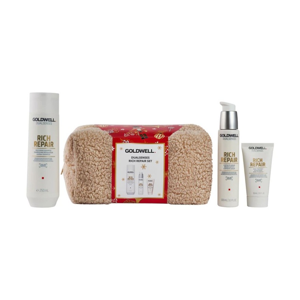 Xmas‑kitet fokuserar på intensiv hårreparation och vård för torrt, skadat eller kemiskt behandlat hår och bygger på Goldwells Rich Repair‑serie. Serien använder teknologin IntraLipid för att återställa lipider inifrån och stärka hårets struktur.